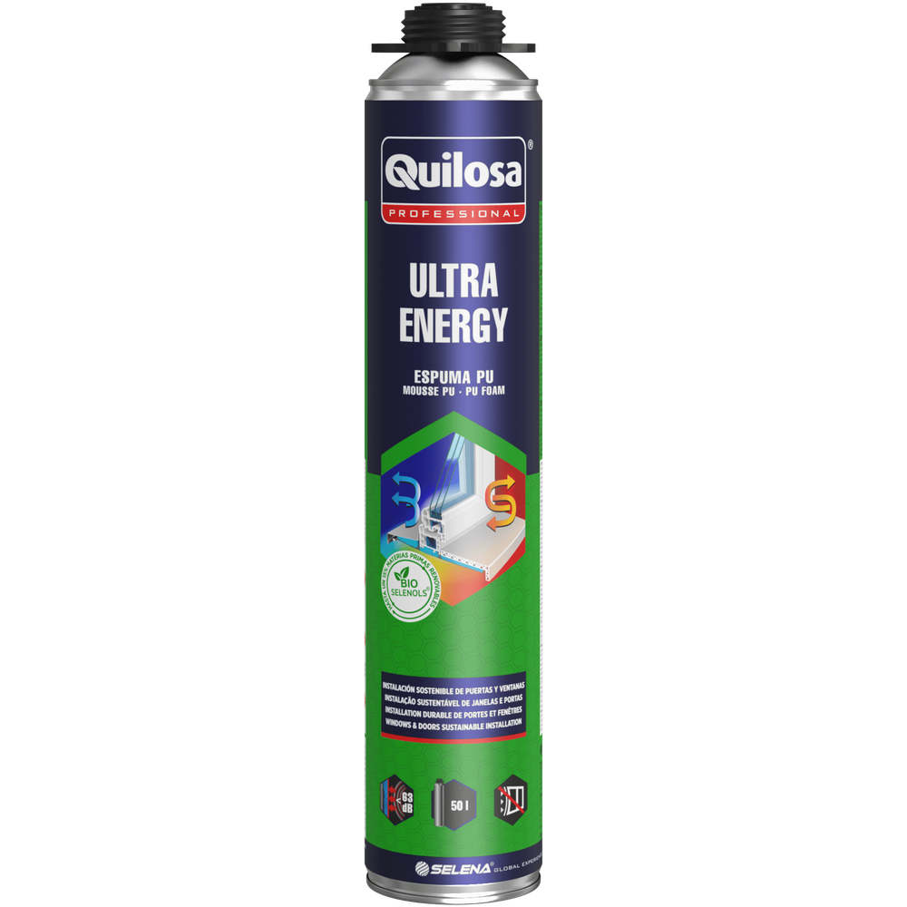Polyurethane foam with an improved formulation, part of which is based on 100% renewable raw materials (BIOSELENOLS® ). The foam is characterised by its high performance of up to 50 litres and a controlled and very low post expansion of between 40% and 70%. Excellent acoustic (63dB) and thermal insulation (0 035 λ) Low expansion foam: prevents deformation of door and window frames Contains Bio Selenols - Patented formula for sustainable construction High yield: 50 litres