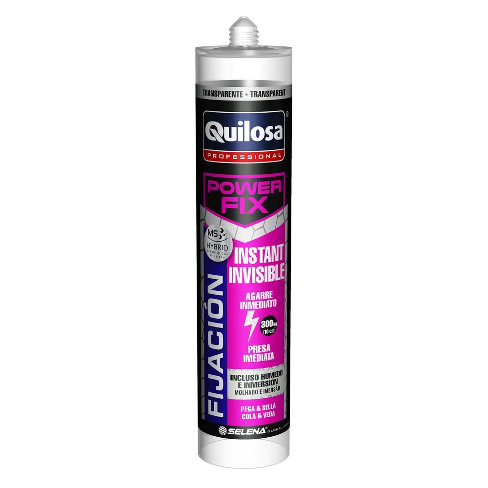 Bonding of elements where immediate, resistant and flexible bonding is required. MULTI-MATERIALS: Glass, brick, metal, marble, stone, wood, ceramics, polystyrene, PVC, HDF, MDF, mirrors, cork and others. NOTE: Do not use on PE, PP, Teflon and bituminous substrates. Crystal clear-coloured joints High initial tack Multi-material High final bonding strength Adheres even on humid surfaces Elastic: Excellent durability that provides extraordinary cushioning of vibrations and expansion and contraction movement Resistant to the harshest of conditions: Thermal resistance (-40ºC to + 90ºC) and UV radiation Indoor and outdoor use